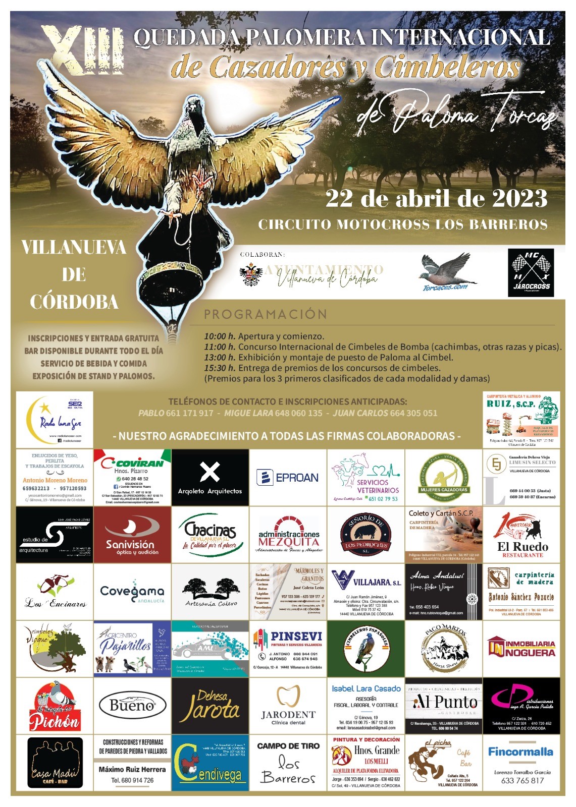 Un año más tendra lugar la XIII Quedada Palomera Internacional de Cazadores y Cimbeleros de la Palom a Torcaz, que este año se celebrará el día 22 de Abril de 2023 en el Circuito de Motocross los Barreros, de Villanueva de Córdoba (Córdoba). La entrada será libre para todos los ...